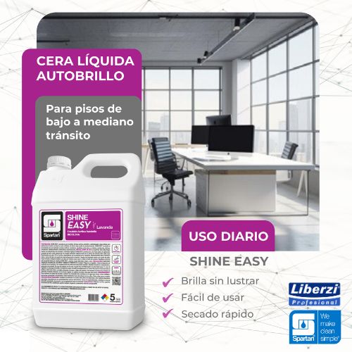 Shine Easy es una emulsión de base acrílica autobrillo y antideslizante, desarrollada para aplicaciones donde se desea un piso brillante, de fácil y bajo costo mantenimiento. Adecuada para tratamiento de pisos vinílicos, cerámicos, graníticos, entre otros, en hoteles, residencias, oficinas, consultorios, establecimientos comerciales y supermercados. Se recomienda para establecimientos de tránsito medio.